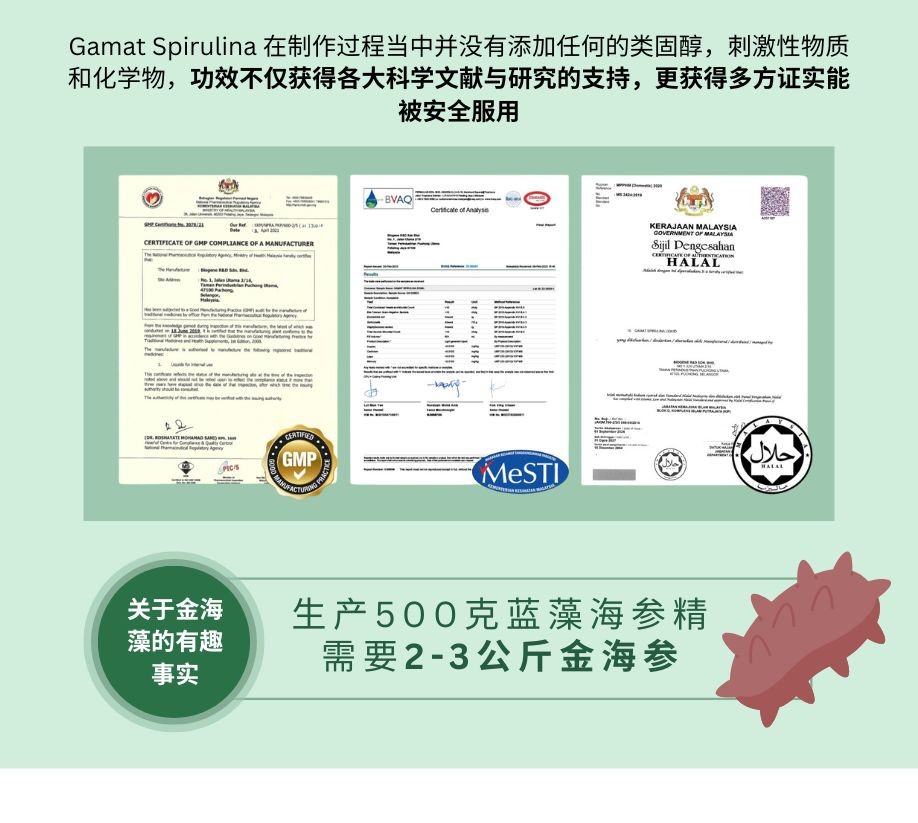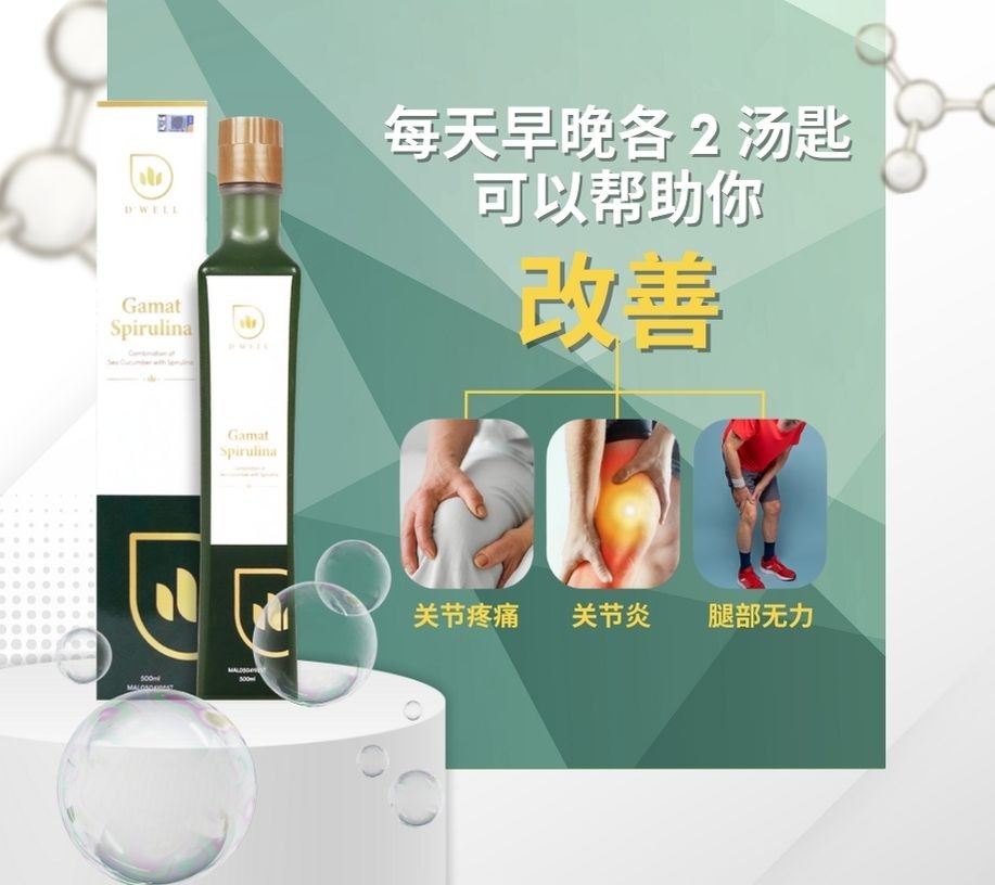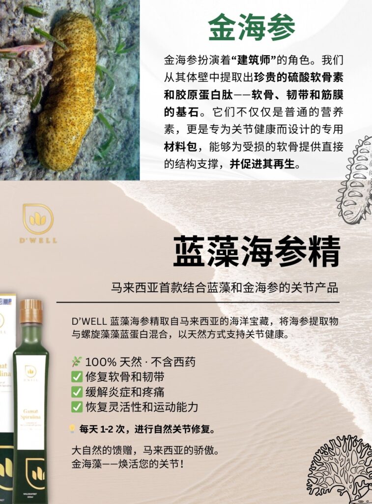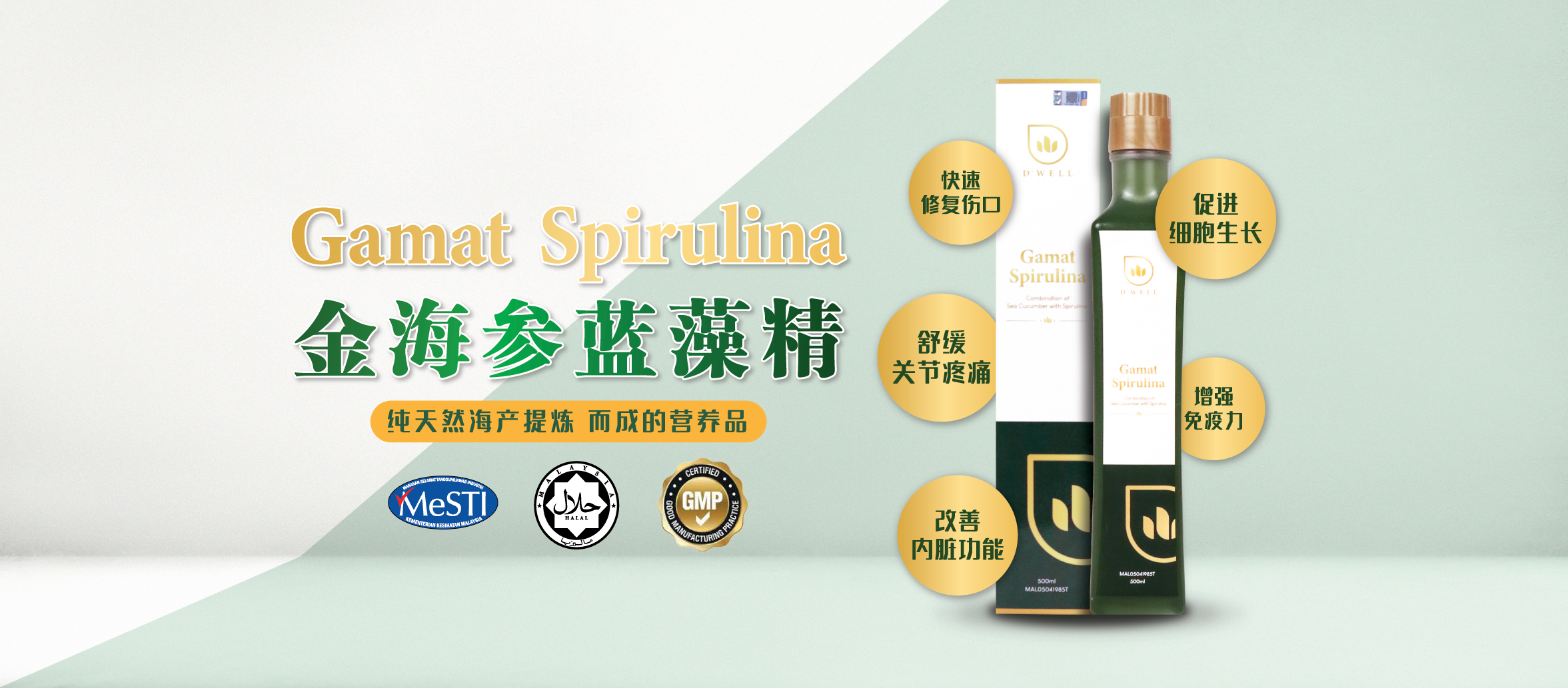 D'WELL 蓝藻海参精(D'WELL Gamat Spirulina)是一款在马来西亚注册的传统健康补充剂(注册号:MAL05041985T)。它采用独特的双效配方,结合了金海参(Stichopus variegatus)提取物与蓝藻(Spirulina)。