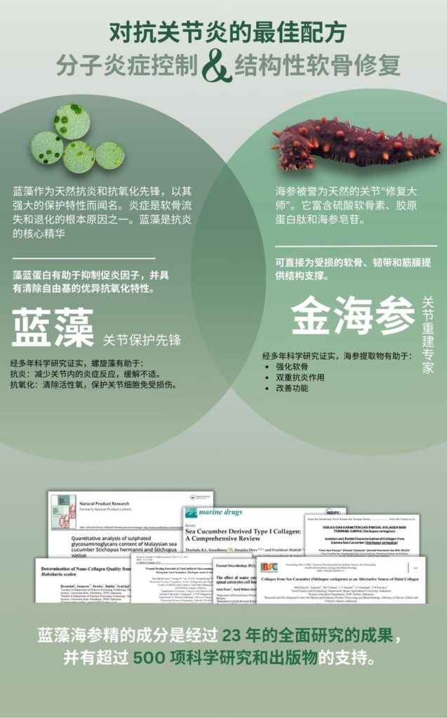 作为马来西亚市场上首款结合这两种生物活性成分的专业配方,该产品主要用于修复关节组织、管理炎症以及增强免疫系统。本产品由 GMP 认证工厂生产,并获得 JAKIM Halal 认证,符合严格的安全与宗教标准。